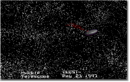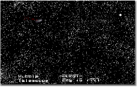 На фотографии 1 вы видите космический челнок. Это посланец Земли. Имя ему "Х-30". Фотография передана буквально на днях с орбитального спутника Марса PhoboSat-4. Справа внизу видна часть Фобоса - таинст-венного спутника Марса. Три спутника серии PhoboSat, один за другим посылаемые к Фобосу, выходили из строя после нескольких часов пребывания вблизи Фобоса. А PhoboSat-4 успешно работает вот уже два месяца. Через несколько дней челнок Х-30 встретится с Гостем, если тот не изменит скорость и направление своего полёта. На двух следующих фотографиях вы можете по-смотреть снимки "Гостя", сделанные астрономами с помощью орбитального телескопа "Хаббл".
